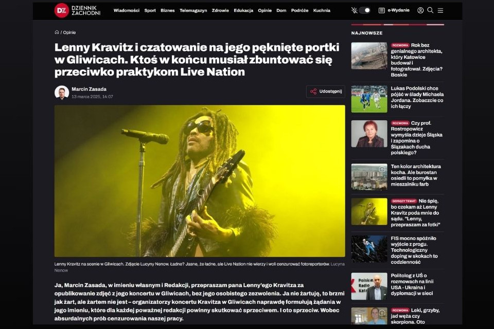 Firma Live Nation Polska – organizator koncertu Lenny'ego Kravitza, zażądała od akredytowanych fotoreporterów przedstawienia zdjęć do akceptacji. Później wystosowała żądanie do "Dziennika Zachodniego" usunięcia zdjęć opublikowanych w serwisie internetowym, strasząc redakcję sądem. Eksperci wskazują, że to działania niezgodne z prawem.