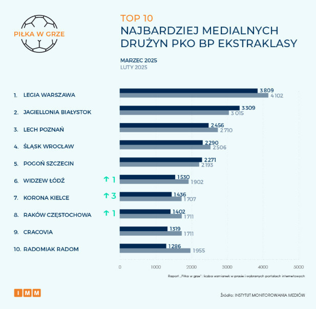 Instytut Monitorowania Mediów przedstawił marcowe zestawienie "Piłka w grze", w którym sklasyfikował najbardziej medialne polskie kluby oraz piłkarzy. Niezmiennie na czele są Legia Warszawa i Robert Lewandowski.
