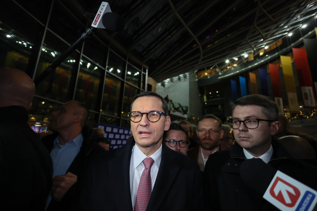 Były premier Mateusz Morawiecki oraz poseł Prawa i Sprawiedliwości Piotr Mueller w budynku TVP przy ulicy Woronicza w Warszawie podczas protestów w grudniu 2023 roku (fot. Leszek Szymański/PAP)