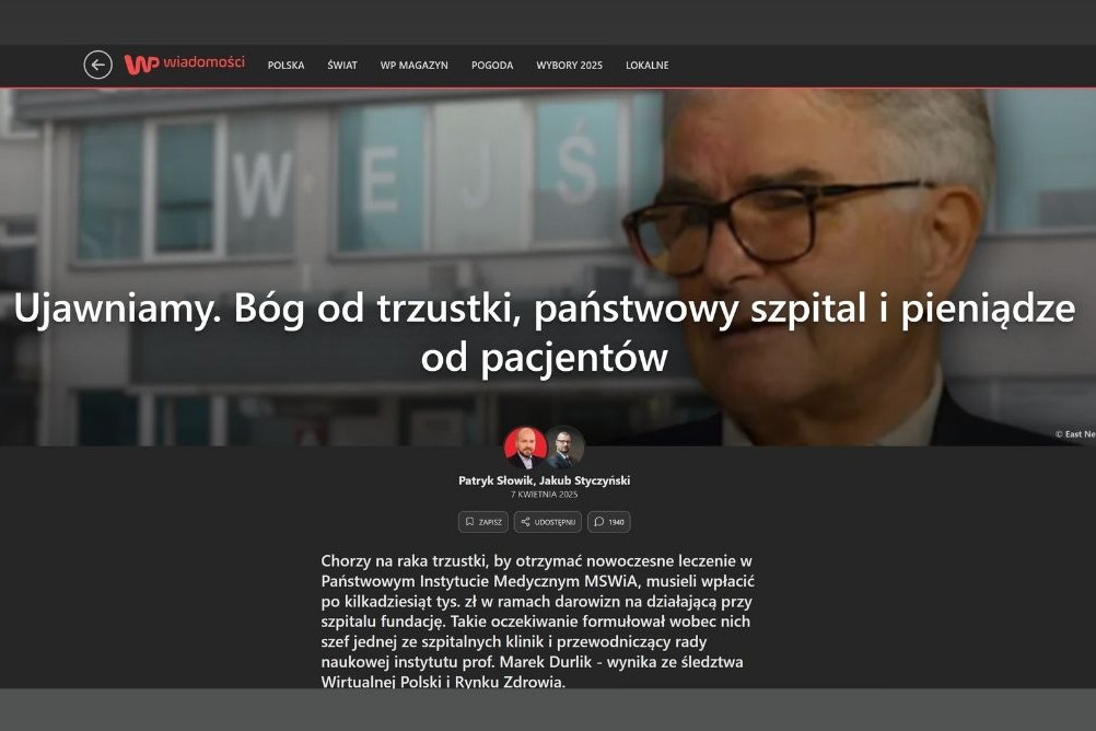 Artykuł "Ujawniamy. Bóg od trzustki, państwowy szpital i pieniądze od pacjentów" (Wirtualna Polska i Rynek Zdrowia) był najbardziej zasięgową publikacją w kwietniu – wynika z raportu "O tym się mówi", przygotowanego przez Instytut Monitorowania Mediów (IMM) we współpracy z Radiem Zet.