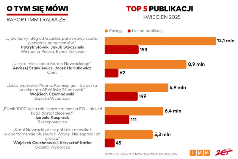 Na drugim miejscu kwietniowego zestawienia znalazła się publikacja Andrzeja Stankiewicza i Jacka Harłukowicza "Ukryte mieszkanie Karola Nawrockiego", która ukazała się ostatniego dnia miesiąca. "Tylko 30 kwietnia powstały 62 publikacje o łącznym zasięgu 8,9 mln kontaktów i można się spodziewać, że liczby te znacznie wzrosną w kolejnym miesiącu, po kolejnych doniesieniach na ten temat" – czytamy w raporcie.