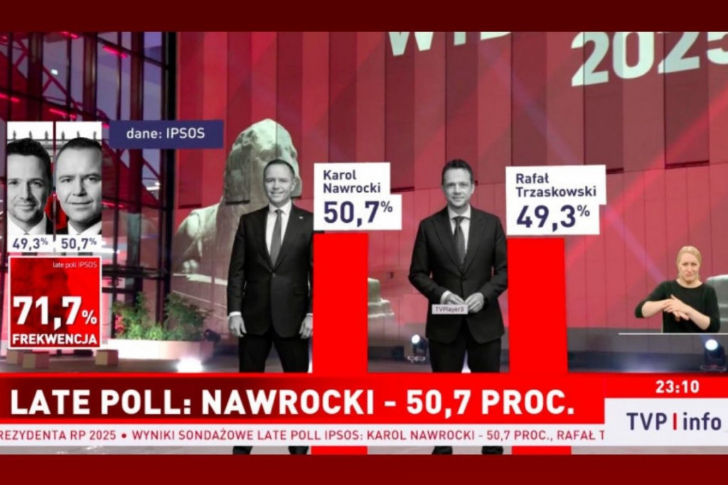 Po godz. 23 zaprezentowano wyniki badania late poll. Prowadził w nim Nawrocki (50,7 proc.) przed Trzaskowskim (49,3 proc.). Z kolei w badaniu exit poll dla Republiki Trzaskowski dostał 50,17 proc. głosów, a Nawrocki – 49,83 proc.