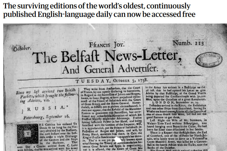 Dzięki wspólnemu projektowi Northern Ireland Office, British Library i platformy internetowej Findmypast pierwsze wydania uważanej za najstarszą na świecie, wydawanej nieprzerwanie od 1737 roku gazety w języku angielskim "The Belfast News Letter" są teraz dostępne bezpłatnie online.