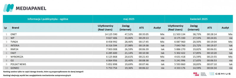 W maju 2025 roku Onet utrzymał pozycję lidera z 14,12 mln użytkowników, co oznacza wzrost o 22,8 proc. w stosunku do kwietnia. Wirtualna Polska zajęła drugie miejsce z 9,83 mln użytkowników (wzrost o 20,21 proc.), a na trzecim miejscu pojawił się TVN 24 z 8,46 mln (wzrost o 38,94 proc.).