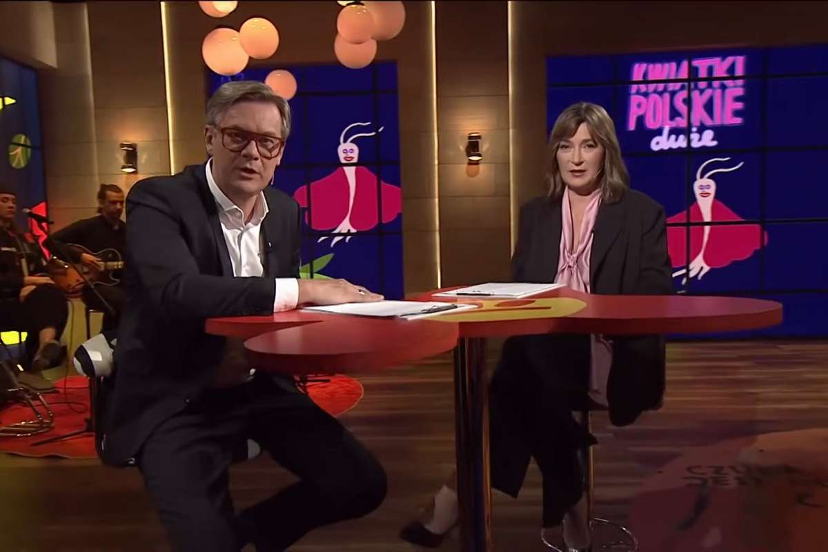 "Kwiatki polskie duże" to mutacja "Kwiatków polskich" realizowana w formule z udziałem publiczności. Prowadzącymi są Grzegorz Markowski i Katarzyna Kasia (screen: YouTube/TVP Info Extra)